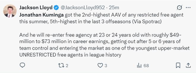NBA记者杰克逊-劳埃德写道:库明加今夏作为受限制自由球员获得的薪资排在第二位,在过去三个休赛期中排名第五。