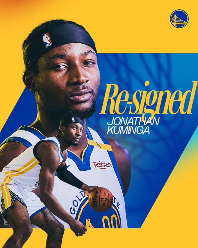 金州勇士队已经重新签下了前锋乔纳森·库明加。库明加22岁,上赛季出战了47场比赛,其中10场首发,场均出场时间为24.3分钟,砍下15.3分、4.6个篮板和2.2次助攻,投篮命中率45.4%,三分命中率30.5%。季后赛库明加场均砍下15.3分2.5篮板1.3助攻,投篮命中率48.4%,三分命中率40.9%。