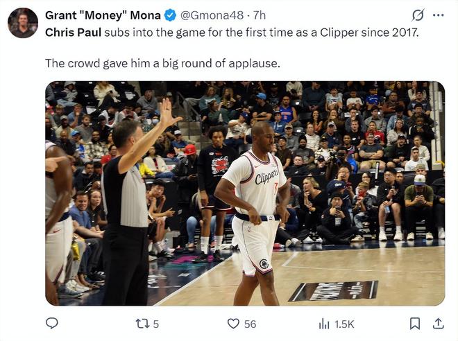 保罗在快船主场的呼声是非常之大的,保罗在LAC有庞大的球迷基础,他是曾经空接之城的奠基人,所以首节CP3登场时球迷们都响起了山呼海啸一般的呐喊声。